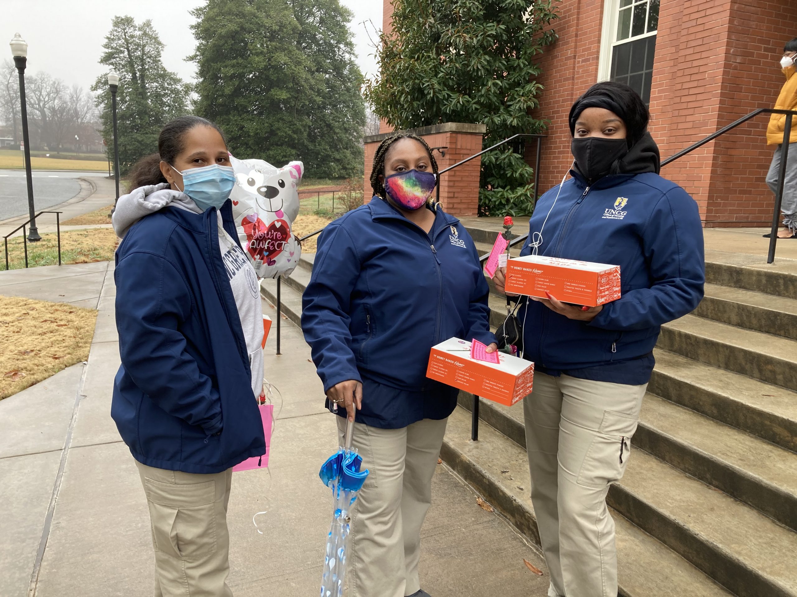 On Monday, February 15th, for the second year in a row, the WGSS program showed our appreciation for UNCG’s housekeepers. The pandemic and the chilly and wet weather didn’t keep us from showing how much the housekeepers mean to the UNCG campus.